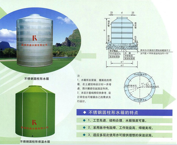 2、不銹鋼圓柱聚氨酯發泡水箱安全衛生、經久耐用 水箱為封閉式,表面光滑,不易附生藻類,水中沉淀物易清洗沖刷,耐高溫并可作消防應急水箱。
